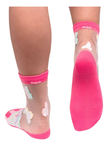 A meia soquete transparente possui estampa e é produzida em fio de poliéster transparente. O fio de poliamida é utilizado em todo desenho da meia. A Sola e a ponteira são em algodão.