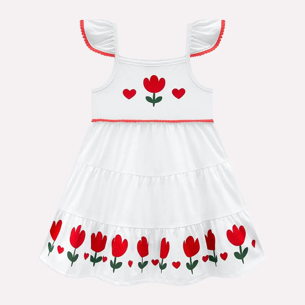Charme em cada detalhe! O vestido infantil menina Kyly é pura doçura e alegria, perfeito para acompanhar as pequenas em dias de sol e muitas brincadeiras! Confeccionado em meia malha 100% algodão, o tecido é leve, macio e proporciona conforto, ideal para a pele delicada das meninas. O destaque fica por conta da estampa encantadora de tulipas e corações, que traz um toque lúdico e romântico à peça.
